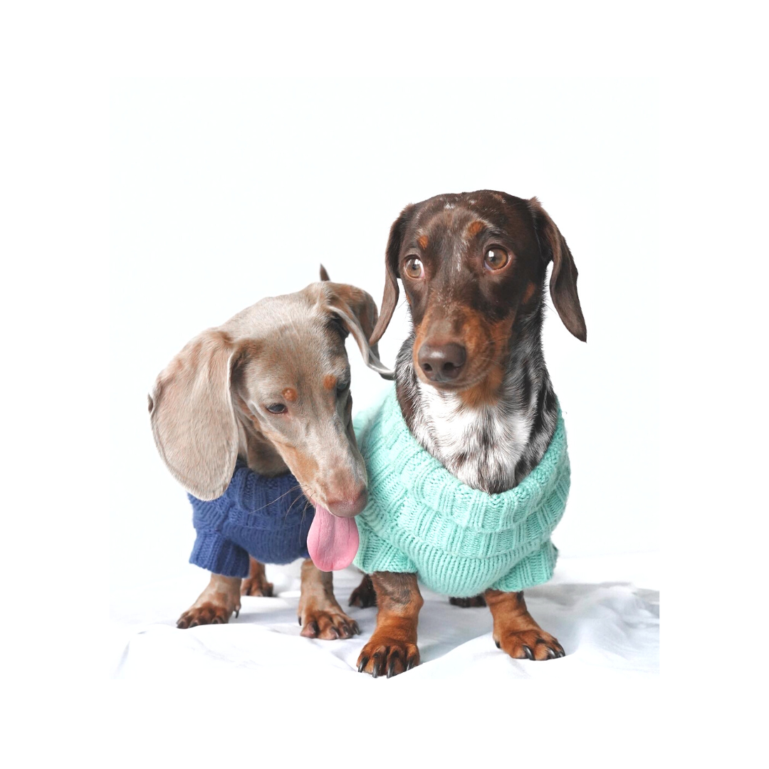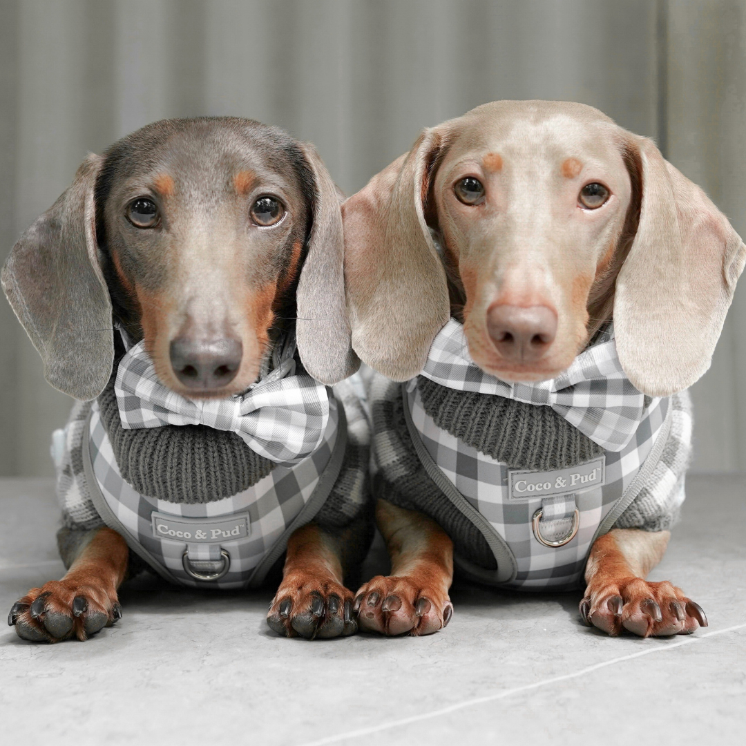 Coco & Pud Toile de Chien Adjustable Dog Harness - GreyCoco & Pud Toile de Chien Adjustable Dog Harness on Long Haired mini Dachshund, Mimi wearing Coco & Pud Coco Cable Dog Sweater in matching Storm Grey